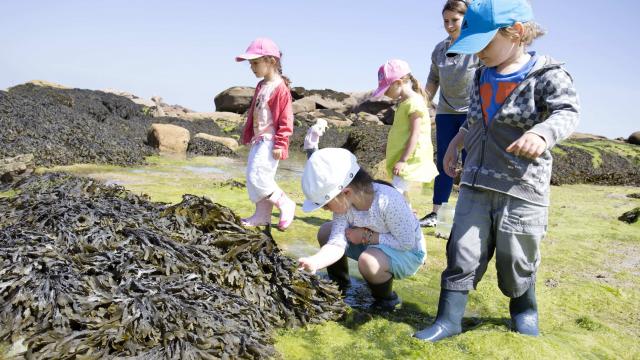 Olivier nous explique : le meilleur moment pour partir à la pêche à pied ou simplement explorer les mares entre les rochers, c’est 1h30 avant la marée basse. Avec un coefficient de 85, et un vent de Nord-Nord-Ouest, la mer ne va pas énormément se retirer aujourd’hui. Mais ça nous laisse largement le temps d’en profiter !