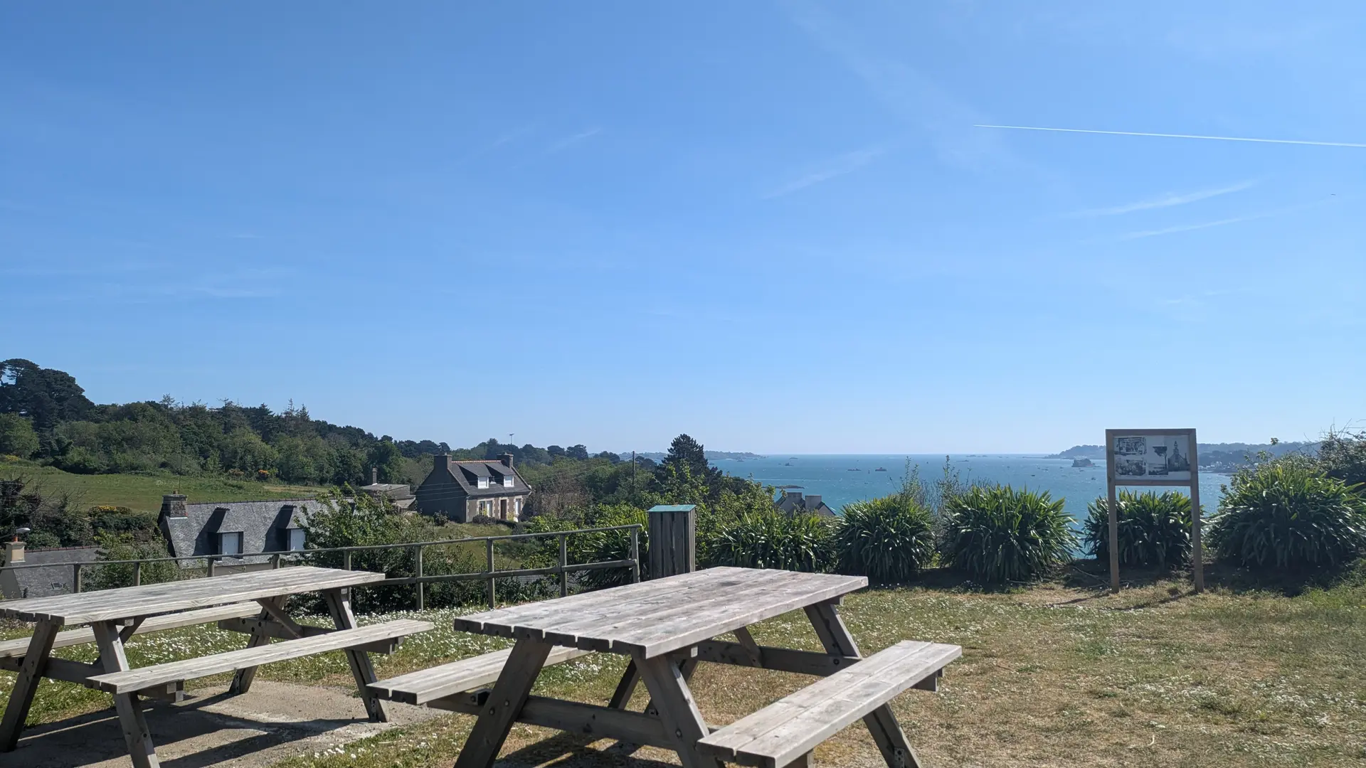 2 tables de pic nique situées sur le GR34, au niveau du panorama de Kermouster, avec vue l'embouchure du Trieux, Loguivy de la mer et l'île de Bréhat. Stationnement possible sur place.
